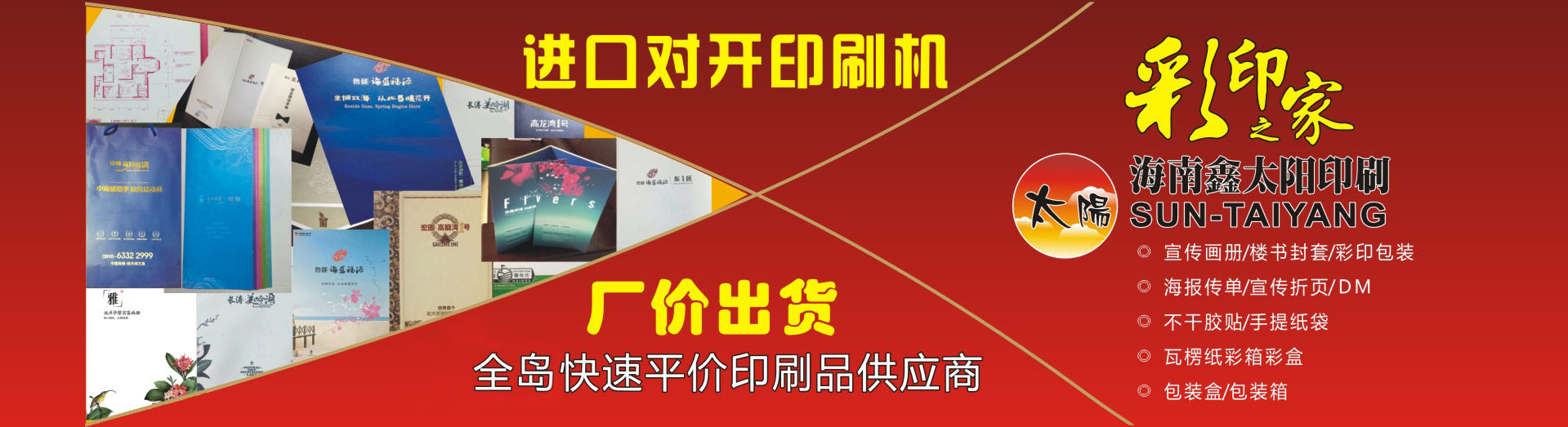海南鑫太陽印刷業(yè)有限公司成立于2002年,主要從事生產(chǎn)海報(bào)畫冊(cè)、傳單簡介、精品包裝、掛歷臺(tái)歷、不干膠貼、手提紙袋、瓦楞紙包裝箱和彩箱紙盒等,公司有日本、德國等對(duì)開及四開高速彩色印刷機(jī)、自動(dòng)膠裝機(jī)、自動(dòng)鎖線機(jī)、自動(dòng)復(fù)膜機(jī)等先進(jìn)的自動(dòng)化設(shè)備,業(yè)務(wù)涉及商業(yè)、地產(chǎn)、水產(chǎn)、食品、農(nóng)林、藥品、化工、航空等行業(yè)的彩印包裝及宣傳印刷品。我公司另外還設(shè)有紙箱包裝廠,可以更好地為客戶配套生產(chǎn)各種檔次級(jí)別的瓦楞紙箱彩盒、普通紙箱紙盒、精裝禮盒等大型產(chǎn)品包裝,產(chǎn)品范圍包括花炮箱、飲料箱、食品箱、魚箱、花箱等。